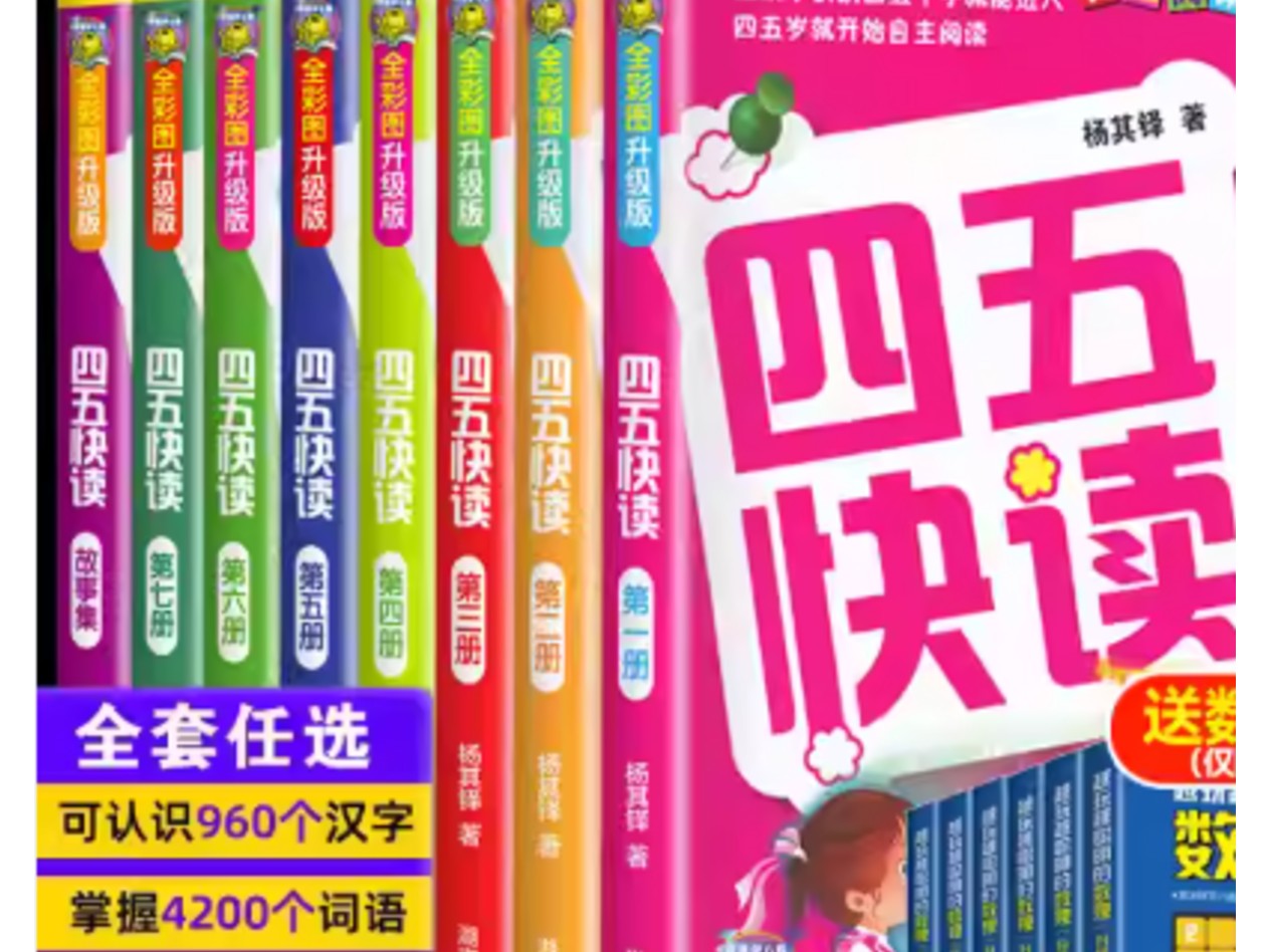 《四五快读》的识字特点是:作者写出了每一个字的教法,均采用形象、比喻、诱导、启发的教学方法,用充满童趣的语言,生动形象的肢体动作和互动交流来教识汉字。边识汉字,边根据已学汉字(从学会32个字开始)循序渐进地进入阅读符合幼儿认知水平、符合儿童生活情趣的词组、句子、短段、长段、短文直至阅读由这些已学汉字编成的故事、童话等。这样,单个枯燥的汉字不断被组合成鲜活的、生动有趣的词语、句子、故事。孩子很快就能够理解汉字所蕴含的意义,在脑海中形成与这些词语、句子、故事所表达的意思相符合的生动画面,一步步品尝到识字乐趣,轻松愉快地识字,并很快获得自主阅读的能力。另外,每课识字阅读之后,设计有思维训练和注意力训练。书中还详叙早期识字十四条原则,及近百种早期识字的方法、复习方法等。